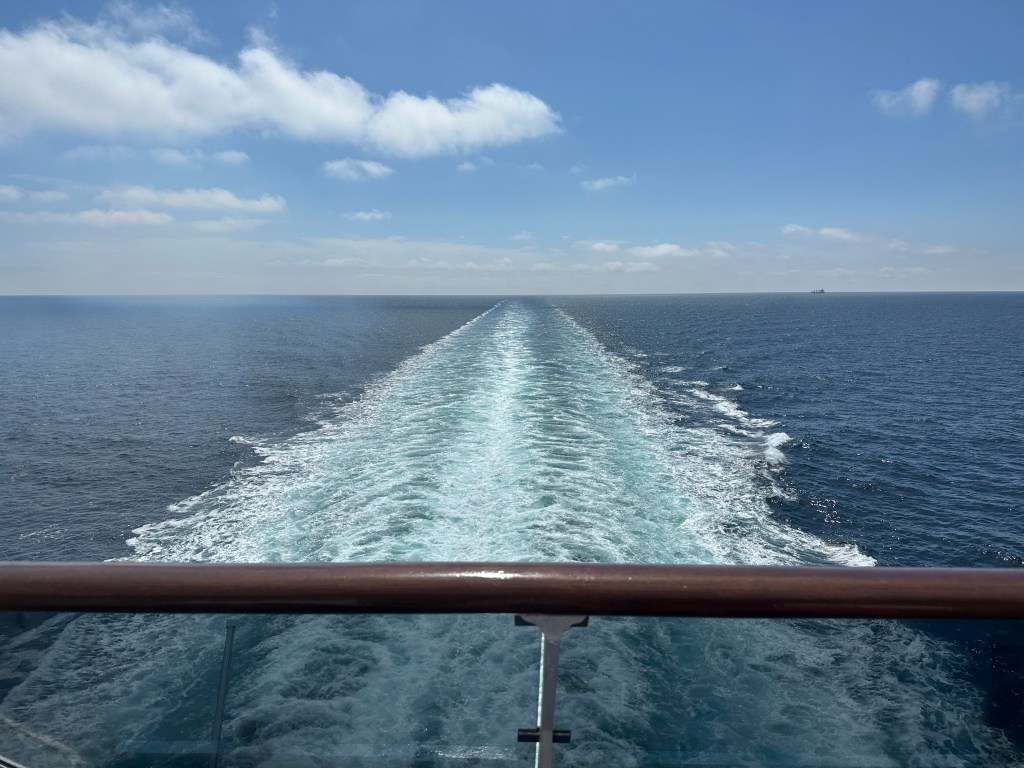 So once onboard we dropped off our carry-on luggage, ate lunch and then waited for sail away. I booked an aft balcony cabin as it is my favorite if they are available when I book. I love that the balcony is larger and watching the wake is a plus. It will become a big asset when we leave Kiel Germany but more on that once we get to that port day. Here is our view for the next 13 days.